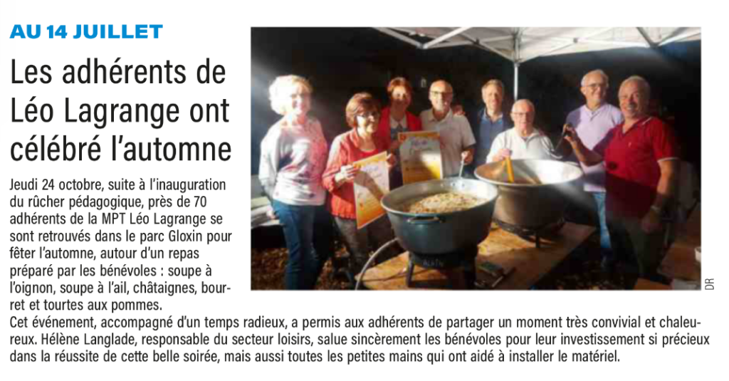 Le jeudi 24 octobre, le parc Gloxin de la Maison Pour Tous Léo Lagrange à Pau a pris des airs de fête pour célébrer l’arrivée de l’automne. Près de 70 adhérents se sont retrouvés autour d’un grand repas partagé, préparé avec soin par les bénévoles de l’association.